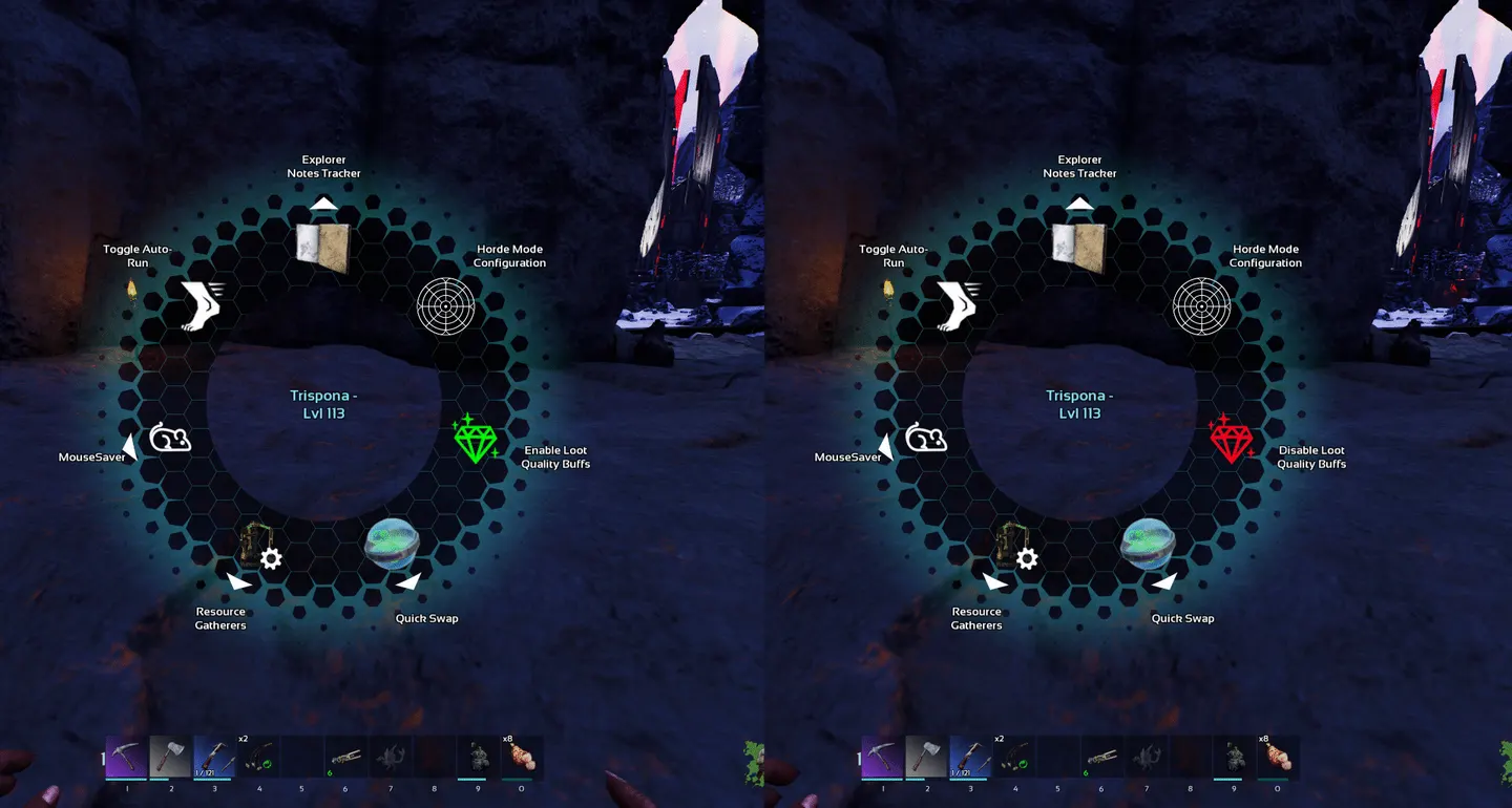 The player always has the persistent control buff, but the radial option is only exposed when it is relevant. In this case, that means only showing the action while the player has a loot-related crate buff worth toggling.